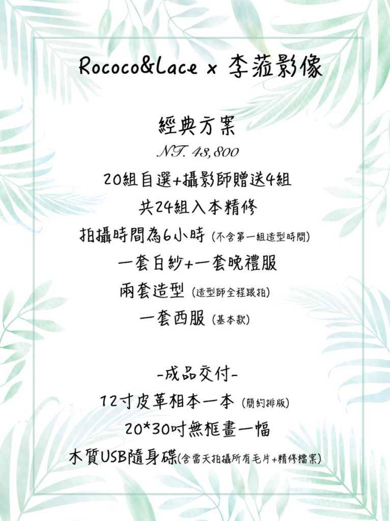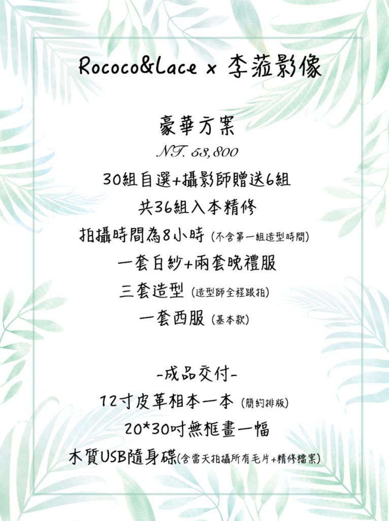 首頁 > 婚紗攝影方案 > Rococo&Lace x 李蒞影像 合作方案 Rococo&Lace x 李蒞影像 合作方案 分類 婚紗攝影方案 關鍵字 rococo, 台北婚紗, 台北婚紗推薦, 台北市, 婚紗包套, 婚紗推薦 Prev上一篇[自助婚紗]emma bridal | 苗栗愛麗絲 | 新竹Emma | 婚紗基地 | yiyu & ghan 下一篇[自助婚紗]台北婚紗 | 婚紗基地推薦 | 南港洛可可 | 愛麗絲的天空 | 蒨蒨&冠文Next 強力推薦作品 [艾茉爾婚攝]港南艾茉爾 | 婚禮紀錄 | 新竹婚攝 | 婚攝推薦 | 阿哲&蘇蘇 [商業攝影]GHK | MK12 | airsoft | wargame | 孫安佐 [活動紀錄]吳克群 | 張鈞甯 | 郭品超 | 范瑋琪 | HOII后益 [自助婚紗]南港婚紗 | 清新 | 可愛 | 浪漫 | 尚倚&美俐 My Dear x 李蒞影像 合作方案 [孕婦寫真]貓貓 | 台北孕婦寫真 | 雜誌感 | 浴缸孕婦寫真 | 53攝影棚